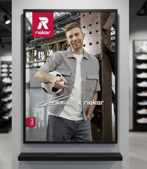 Mit Christoph Kramer gewinnt Rieker einen Markenbotschafter, der Sportlichkeit, Lifestyle und urbane Coolness perfekt verkörpert. Ziel der Zusammenarbeit ist es, die Schuhkollektionen crossmedial zu inszenieren – von Print über Social Media bis POS – und die Produkte sowohl für sportlich-aktive als auch lifestyle-orientierte Kunden erlebbar zu machen. Jede Saison wird mit einer eigenen Kampagnenstory umgesetzt, die Bildwelt, Kanäle und POS-Material aufeinander abstimmt.